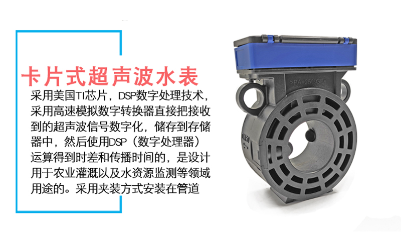 新一代的CWIS系列型卡片超声波水表/超声波流量计是采用美国TI芯片,DSP数字处理技术,采用高速模拟数字转换器直接把接受到的超声波信号数字化,储存到存储器中,然后使用DSP(数字处理器)运算得到时差和传播时间的。是设计用于农业灌溉以及水资源监测等领域用途的。采用夹装方式安装在管道上。